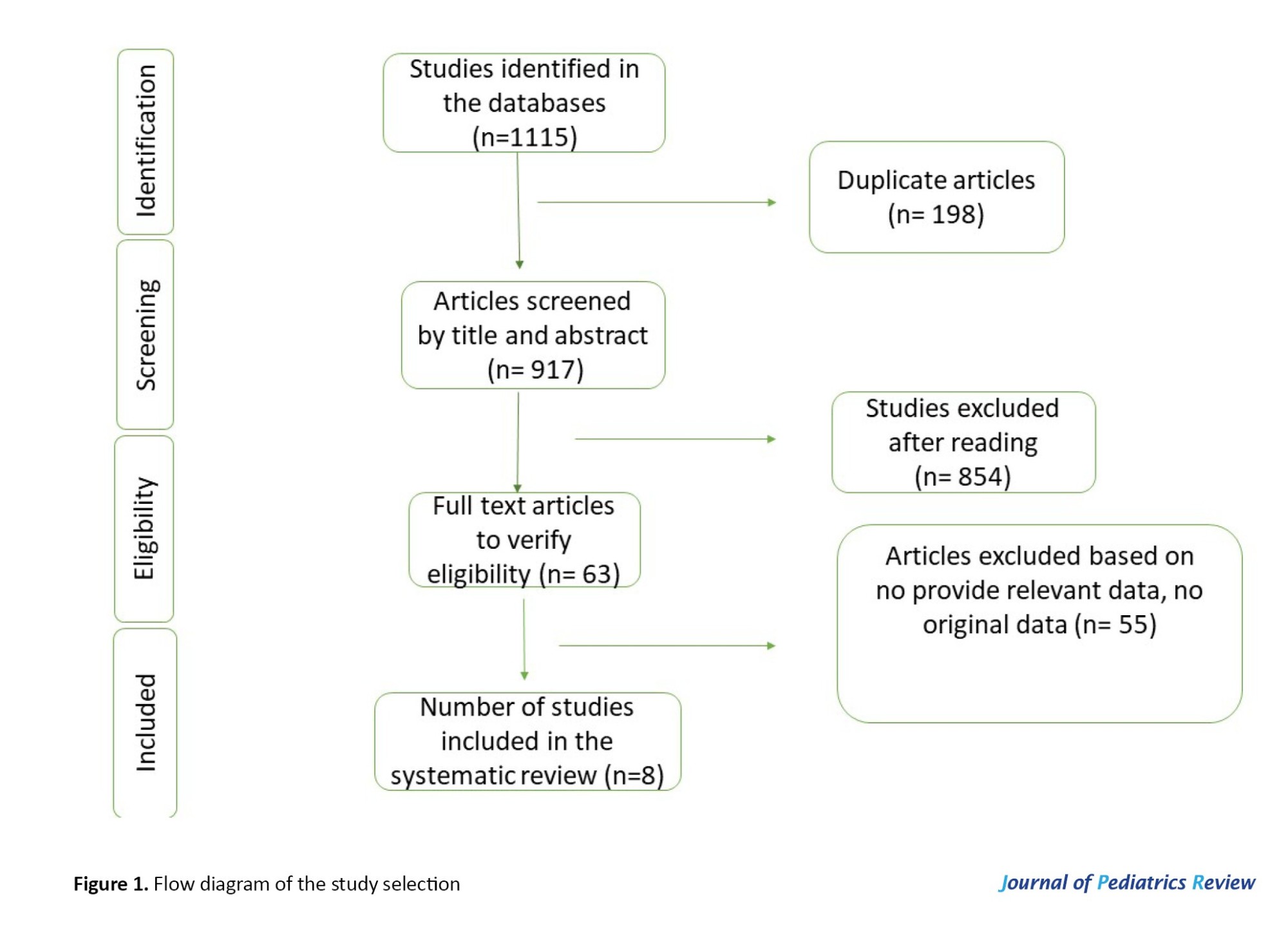 We found 1115 articles and, after removing duplicates, 917 articles were selected for the next step. After reviewing the studies by two separate researchers, 63 studies were selected, and finally, 8 studies were selected to be included in the review study (Figure 1).