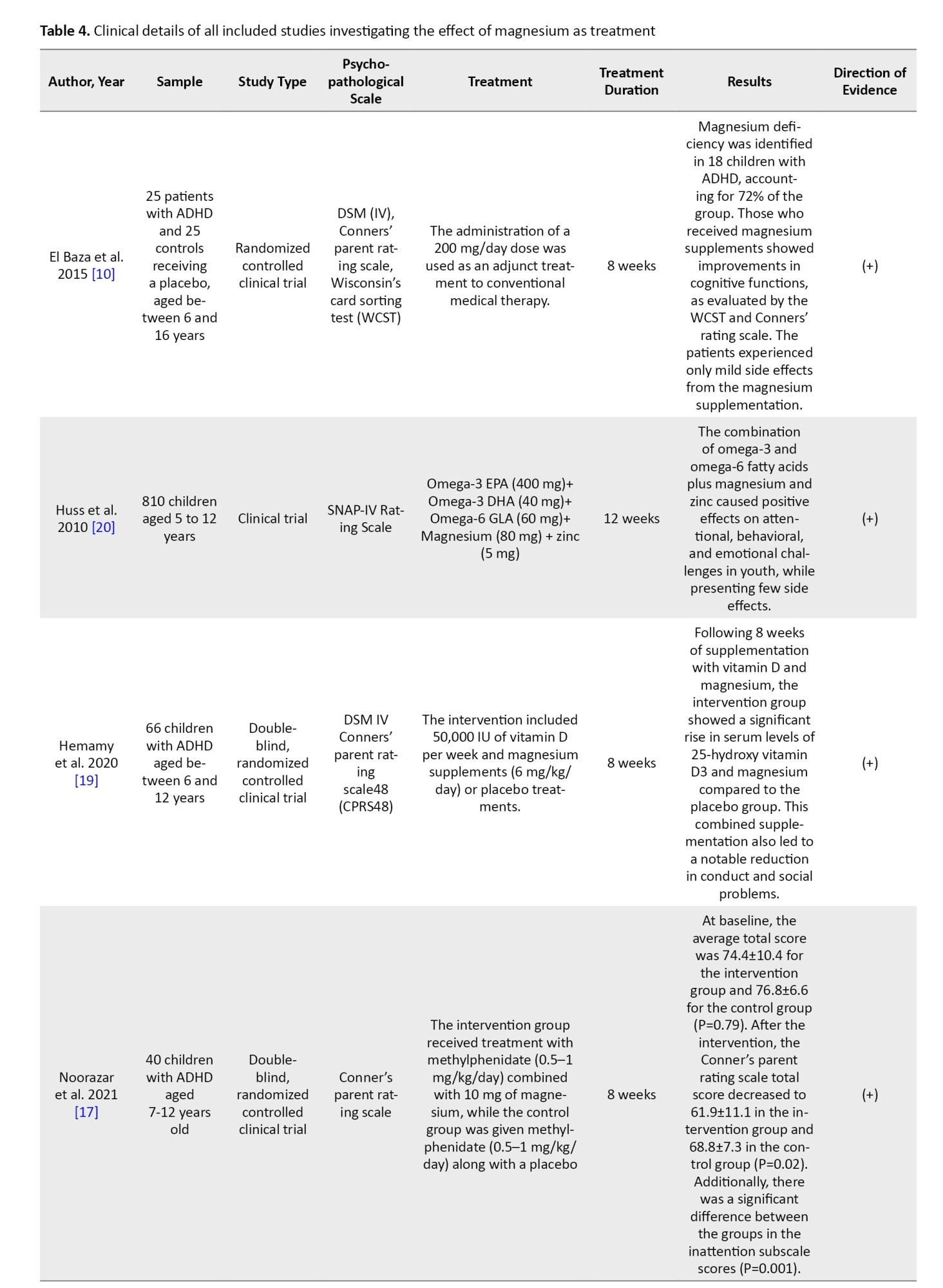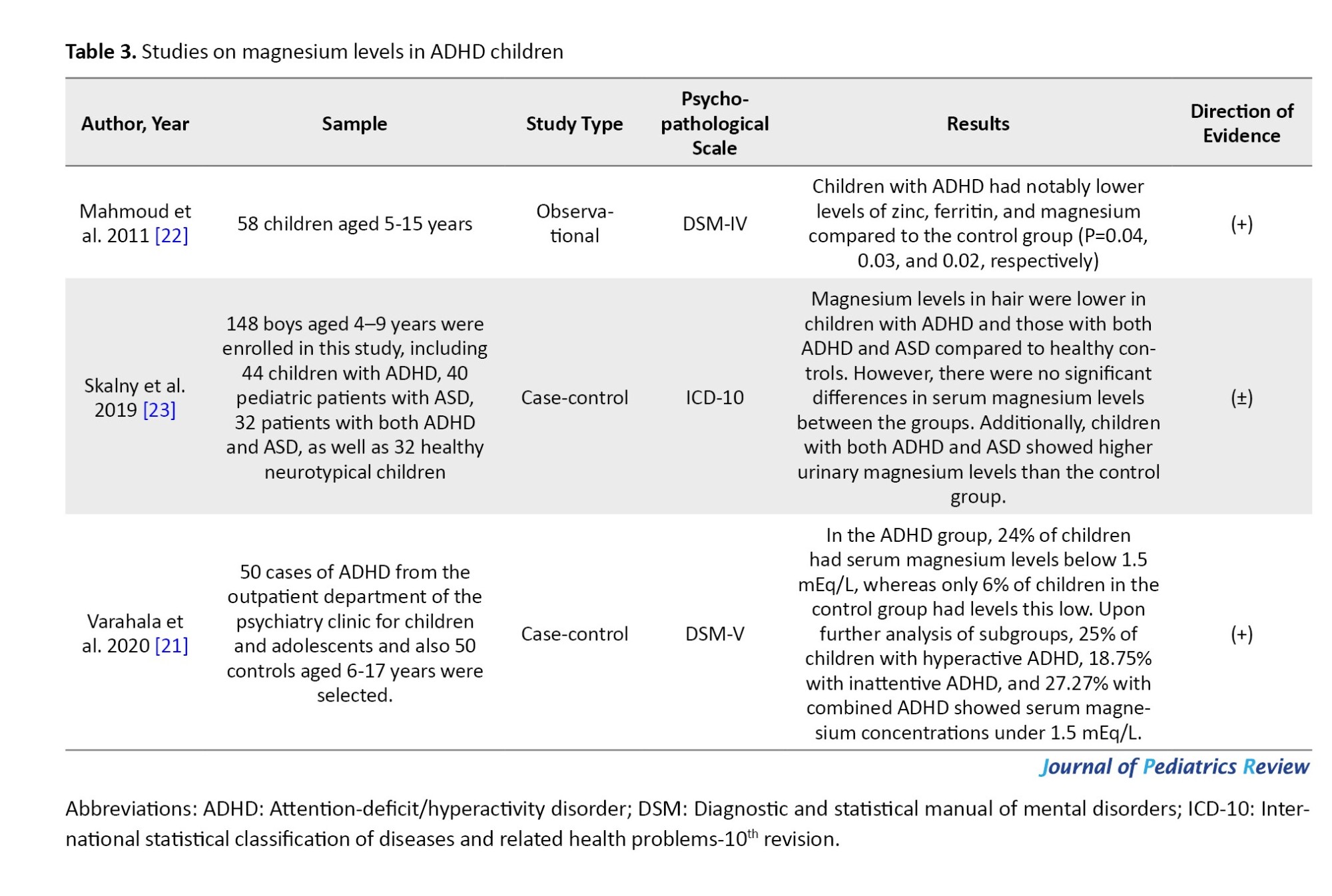 In Mahmoud et al.’s study, 58 hyperactive children and 25 healthy children in the age range of 5-15 years were selected. Serum levels of magnesium were lower in hyperactive children compared to healthy children, and ferritin and zinc levels were also reported to be lower in these children [22].