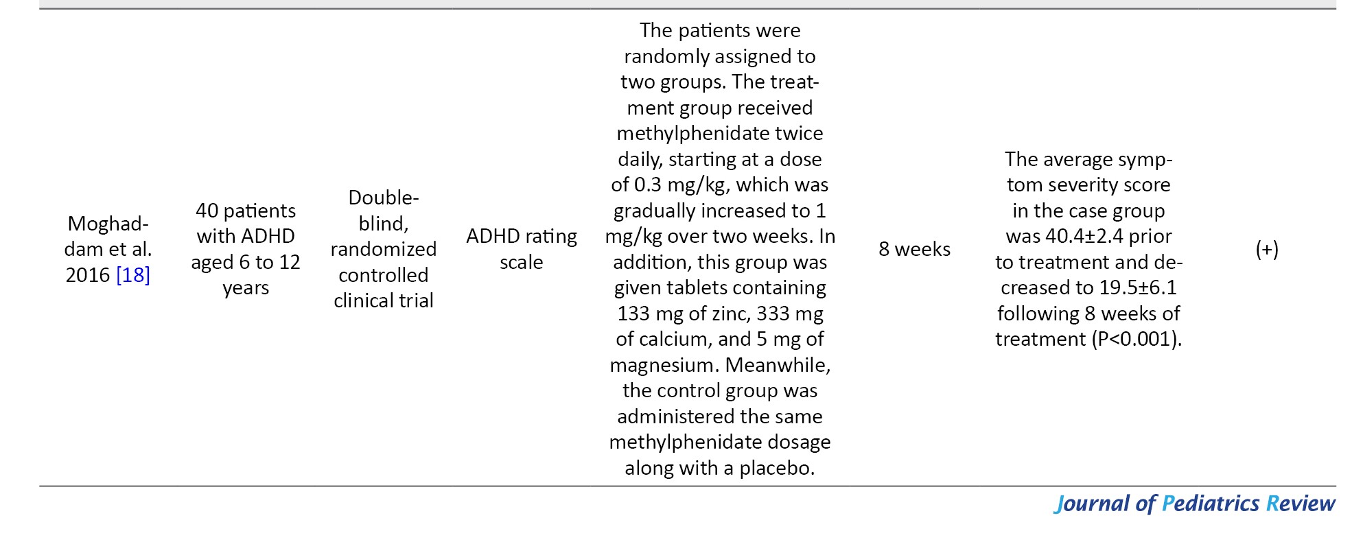 Moghaddam et al. in 2016, 40 ADHD children were supplemented with zinc, magnesium (5 mg/day), and calcium for 8 weeks, and after the intervention, a significant reduction was observed in the severity of hyperactivity symptoms [18].