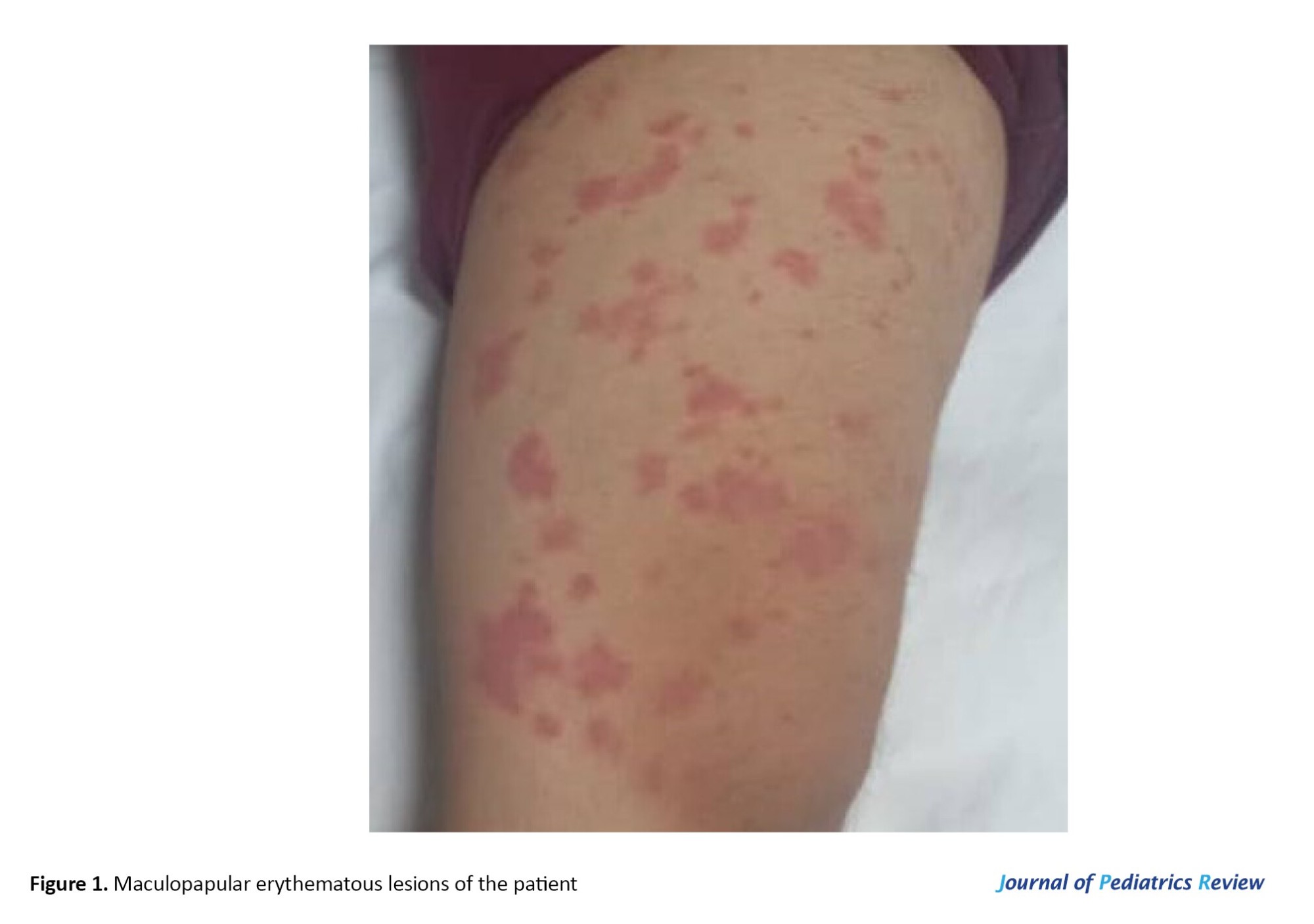 In his physical examination, scattered maculopapular erythematous and scaling lesions were observed in both upper and lower limbs (Figure 1). His vital signs were stable and neurological, and fundus examinations were intact. There was no sign or history of malar rash, arthritis, hepatosplenomegaly, or lymphadenopathy. According to the patient’s parents, due to improvement in their child’s clinical condition and normal complement level, they discontinued rituximab treatment about six months ago.