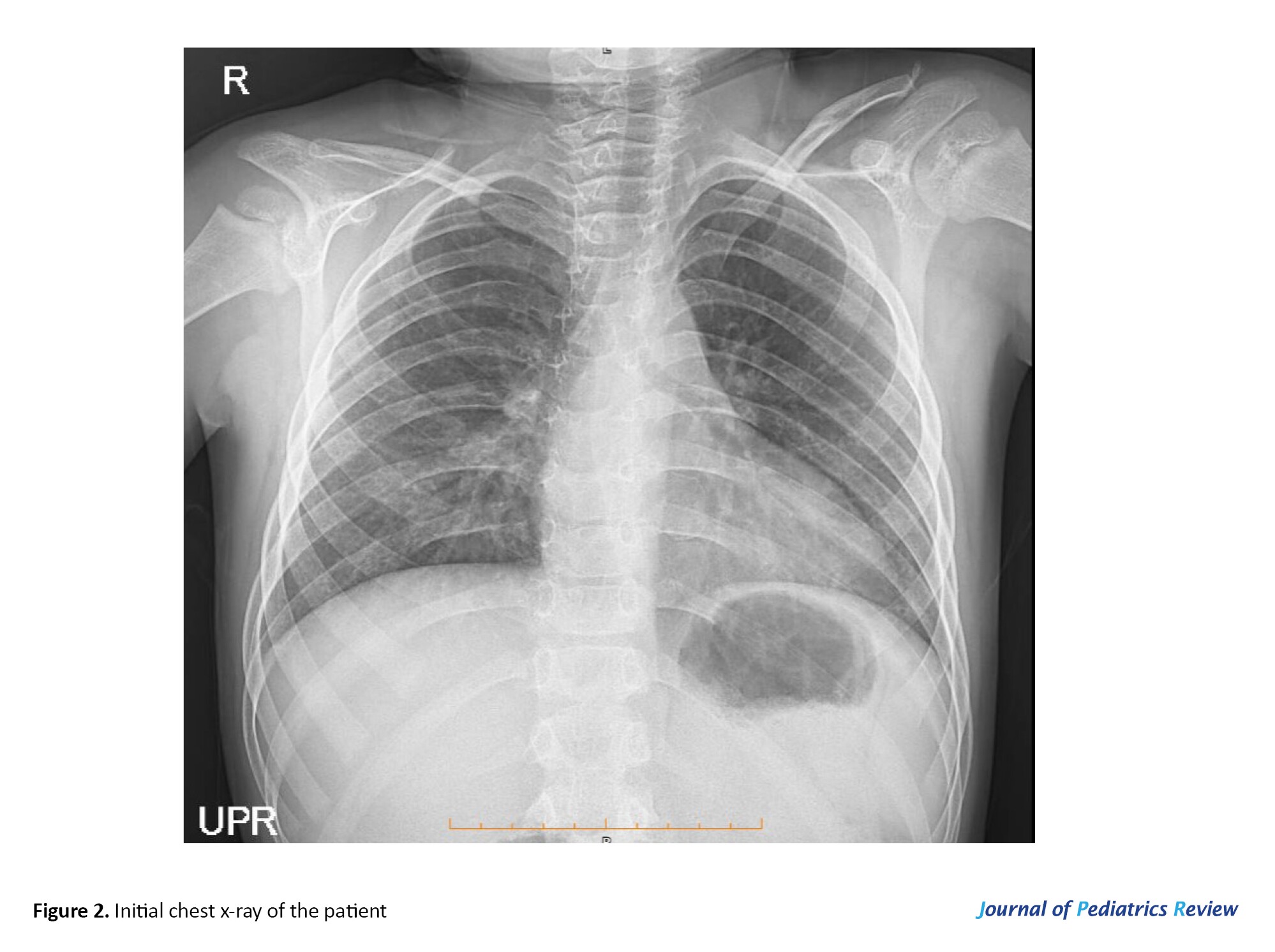 In his past medical history, he had a history of bone pain, arthralgia, and intermittent fever when he was 2 years old. Due to the presence of anemia and normal rheumatologic laboratory tests, he was diagnosed with juvenile idiopathic arthritis (JRA) and was treated with methotrexate along with oral corticosteroids. Later, he had an episode of severe dyspnea, low oxygen saturation level, and hemoptysis when he was three years old. He was admitted with an initial diagnosis of diffuse alveolar hemorrhage (DAH). During his hospitalization, there were high levels of C-reactive protein (CRP), erythrocyte sedimentation rate (ESR), anemia, and hypocomplementemia (low C4 and C3). Normal ANA, anti-dsDNA, rheumatoid factor (RF), anti-cyclic citrullinated peptide (anti-CCP), anti-neutrophil cytoplasmic Autoantibody, Cytoplasmic (C-ANCA), perinuclear anti-neutrophil cytoplasmic antibodies (P-ANCA), anti-Ro, anti-La, lupus anticoagulant, anti-glomerular basement membrane diseases (Anti-GBM), anti-cardiolipin Ab, anti-phospholipid Ab, and urine analysis were also observed. The diagnosis of hypocomplementemia was confirmed for him. When he was 4 years old, he also had a history of severe pulmonary cytomegalovirus (CMV) infection, which was treated with ganciclovir.