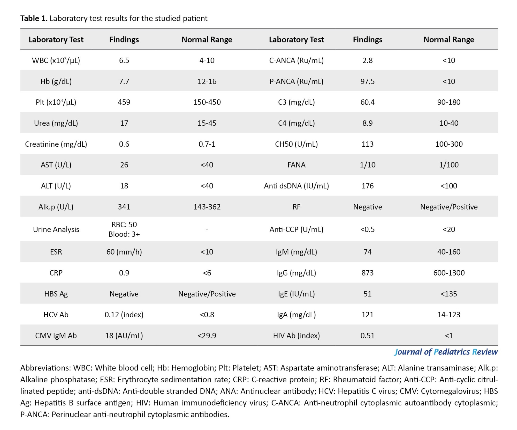 In our evaluation, he had anemia, high ESR level, hematuria, low levels of C3 and C4, elevated P-ANCA level, and positive anti-dsDNA with a normal amount of other rheumatological tests. The viral markers were negative for human immunodeficiency virus (HIV), CMV, hepatitis B virus, and hepatitis C virus (HCV). The immunoglobulin (Ig) M, IgG, IgE, and IgA levels were also in the normal range (Table 1).