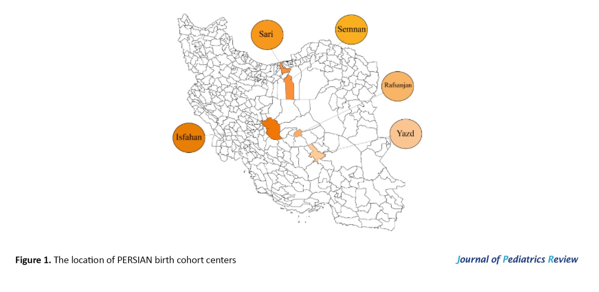 National cohort studies have been established since 2013 under the title of prospective epidemiological research studies in Iran (PERSIAN). It is one of the pioneers of developmental origins of health and diseases research in the Middle East and North Africa region. The PERSIAN birth cohort study is a branch of the PERSIAN cohort. The PERSIAN birth cohort study, with a population of about 15000 pregnant women, was started in five medical universities (Isfahan, Yazd, Semnan, Kerman, and Mazandaran) during 2016-2017 (Figure 1). The large sample size and diverse population of the PERSIAN birth cohort provide a valuable resource for advancing developmental origins of health and disease research. The study protocol was approved by the Iranian Ministry of Health and Medical Education institutional Ethics Committee [6]. The participants met the following inclusion criteria: Being pregnant, of Iranian nationality, residing in the designated geographical area for at least one year, providing informed consent to participate, and agreeing to comply with follow-up requirements. The participants were excluded from the PERSIAN birth cohorts if any of the following occurred adverse pregnancy outcomes, maternal or child death, migration out of the study area, or unwillingness to continue participating. At the first visit, prenatal data were collected by using face-to-face interviews. The children were assessed at birth, 2, 4, 6, 12, and 24 months; thereafter, they will be followed annually.