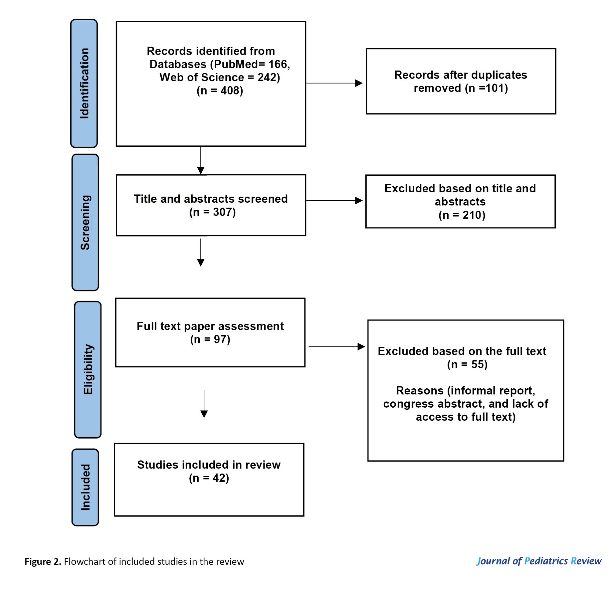 A total of 408 articles (166 PubMed and 242 WOS) were published from the PERSIAN birth cohort in international and national databases. Among the included articles, 101 duplicates were identified and excluded. Conference abstracts and informal reports were not included in this review. Finally, 42 studies were selected from five PERSIAN birth cohort centers (Figure 2).