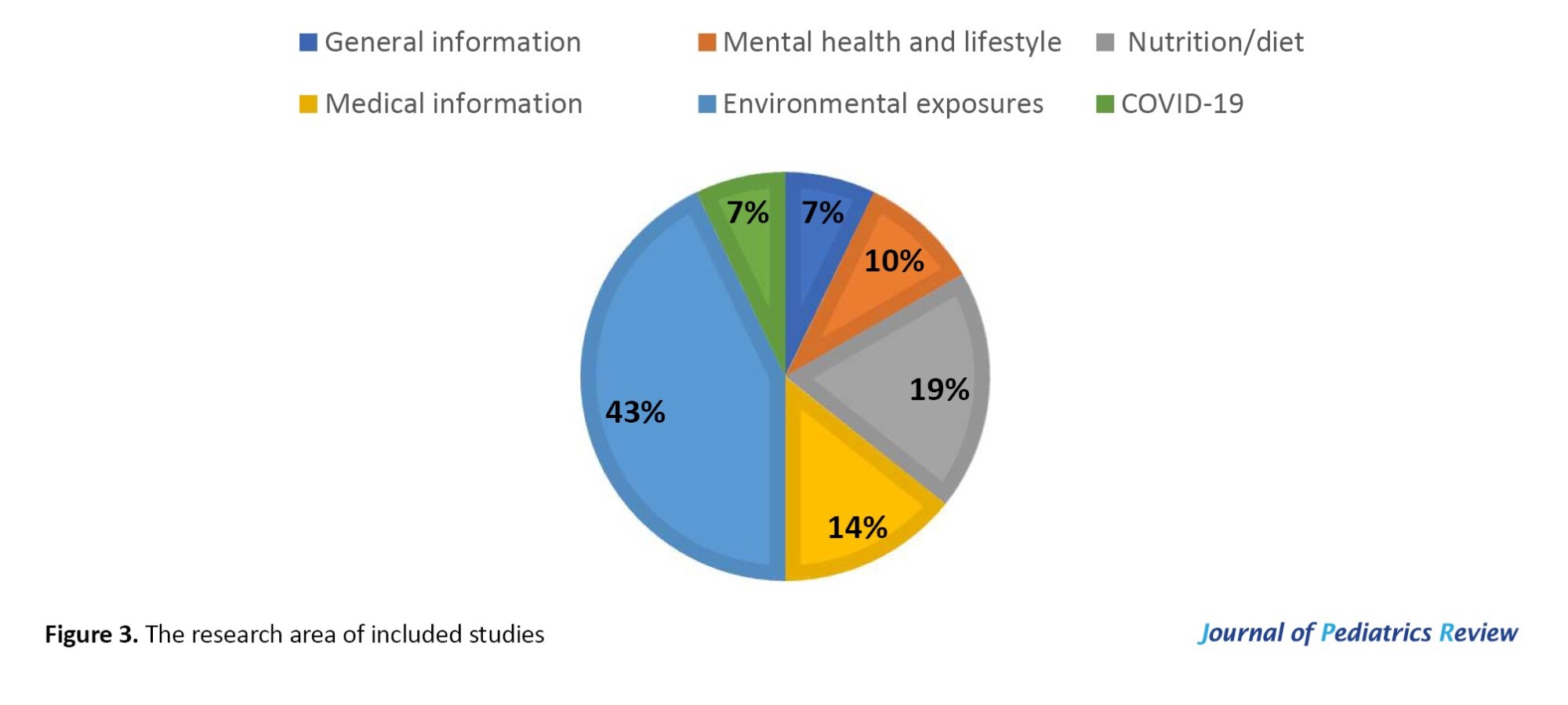 To identify the research areas of the studies conducted under the PERSIAN birth cohort protocol, the research domains were divided into five subcategories: 1) Registration and general information, 2) Mental health and lifestyle, 3) Environmental and occupational exposures, 4) Nutrition and diet, and 5) Medical information [6]. The lifestyle domain included issues such as physical activity, sleep patterns, risky behaviors like smoking, alcohol consumption, and substance abuse or addiction. Meanwhile, environmental exposures were air pollution (outdoor and indoor), noise pollution, radiations (ionizing, ultraviolet, and non-ionizing), water pollutants, allergens and biological organisms, metals, pesticides, tobacco smoke (active and passive), and other chemical compounds [6, 9].