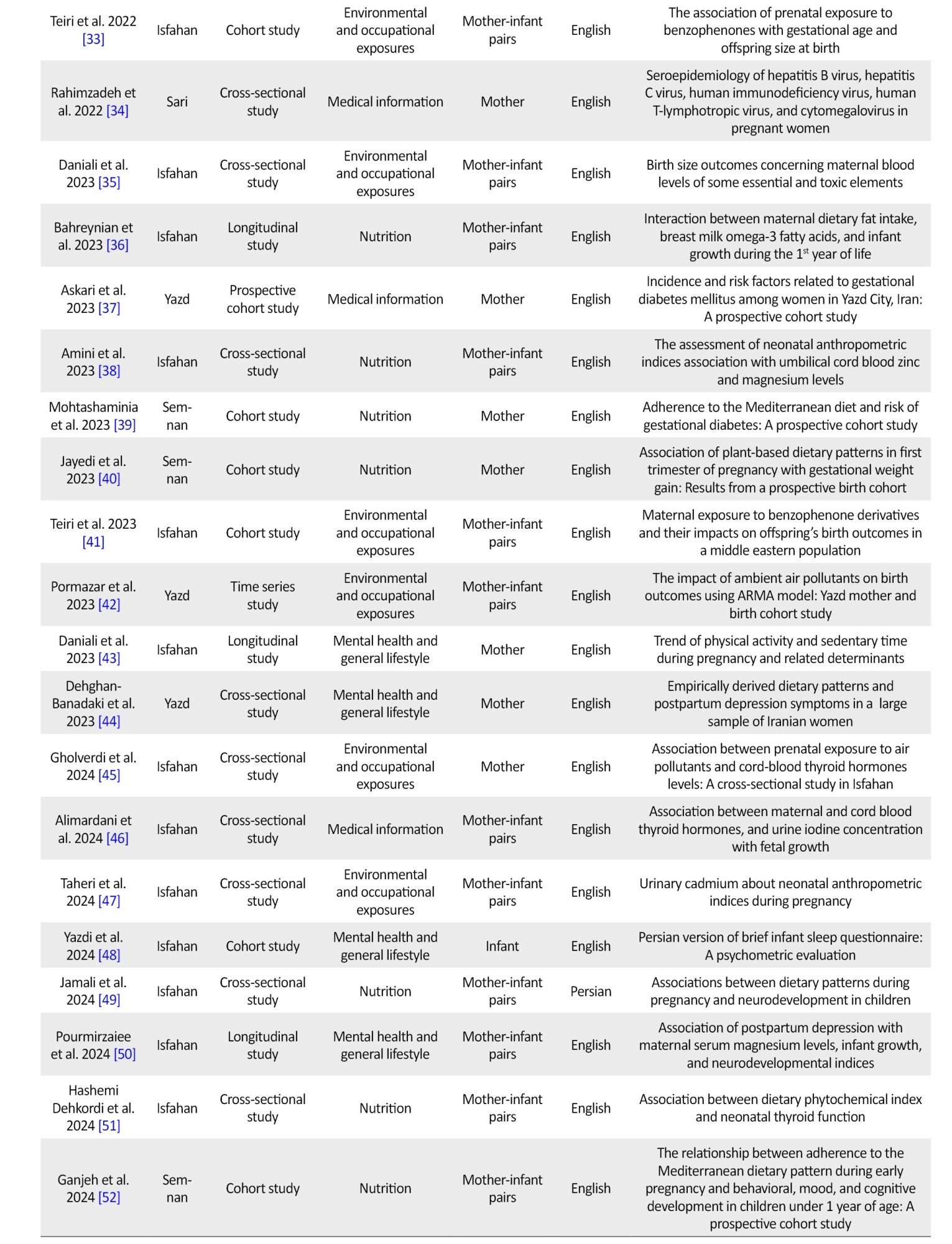 Based on the available knowledge, this study is the only document that focuses on the achievements related to the PERSIAN birth cohort centers. The main limitation of our research was the lack of access to the full text of some studies, which hindered our ability to identify the study design and research area. In response, we contacted the authors of those studies and requested that they provide us with the full text of their articles. Despite our efforts to address this issue, we have no access to the full text of some studies. Additionally, identifying the research area in some studies was difficult.