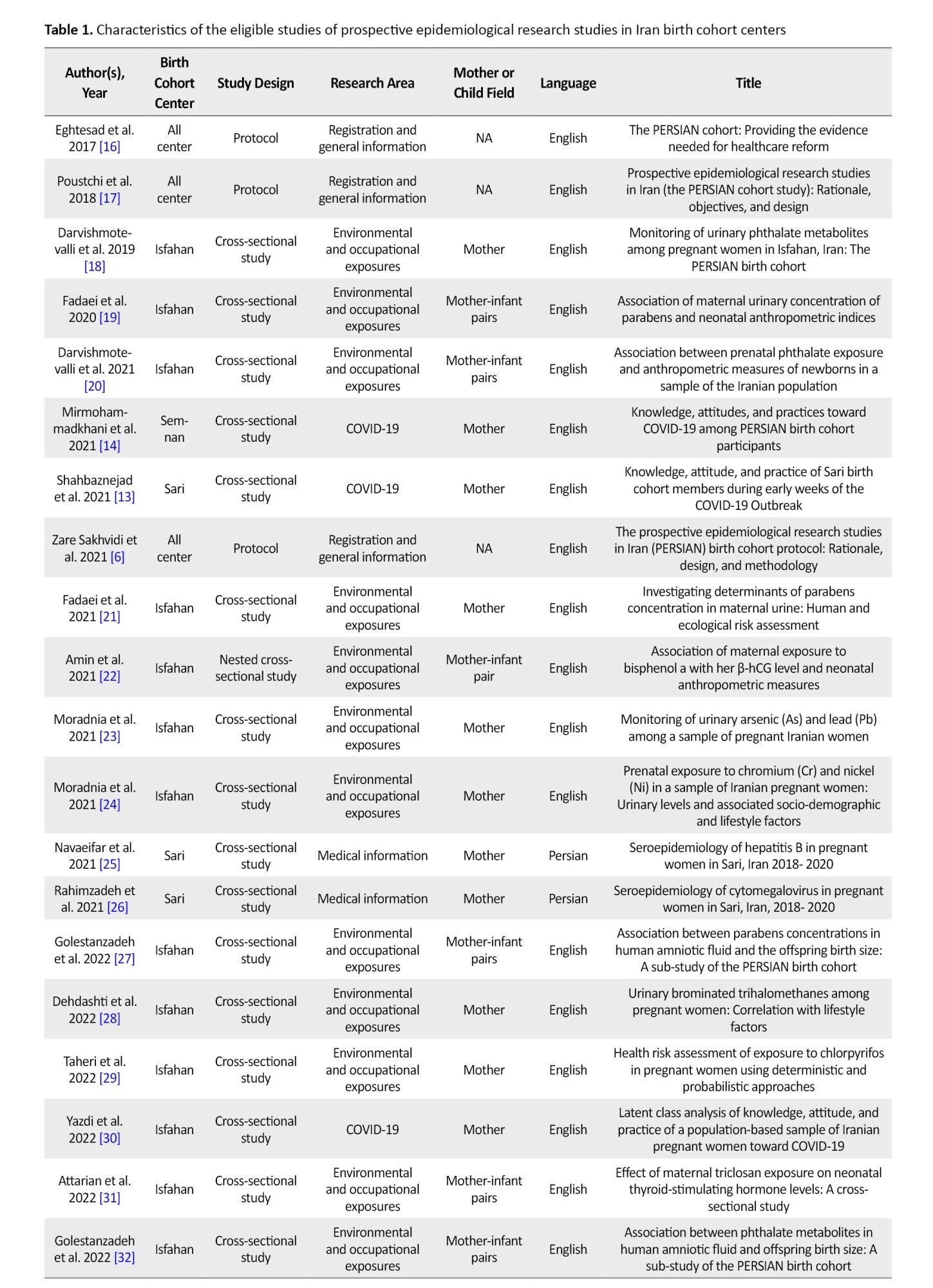 The inclusion criteria consisted of: 1) Studies published in both Persian and English languages since the beginning of 2016, and 2) Studies related to the PERSIAN birth cohort. Meanwhile, the exclusion criteria were: 1) Conference papers, dissertations, proposals, and letters to the editor, 2) Unavailability of the full text of the studies, and 3) Other birth cohorts in Iran.