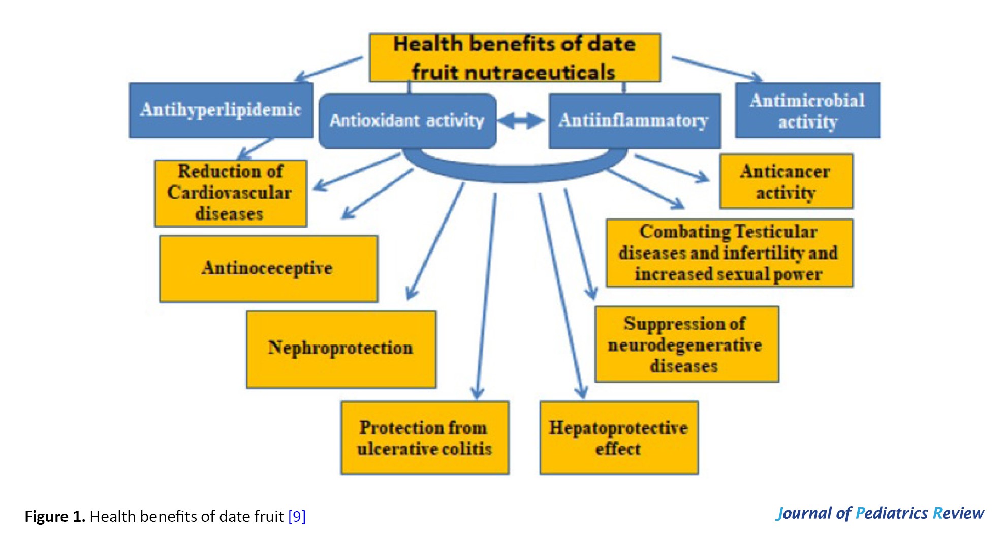 Dates play a crucial role in balanced eating due to their rich content of vitamins (particularly vitamin B), tannins, crude fiber, and plant compounds that offer antioxidant benefits and can help prevent illnesses [6, 7]. Dates have a high sugar content, accounting for 50-88% of their total weight, depending on the cultivar type, ripening stage, and moisture content. Their pulp mainly consists of sugars, such as fructose and glucose, which account for about two-thirds of its total flesh, with water making up one-fifth, and a small portion of dietary fiber. Their substantial sugar makes them a great energy provider for people [8]. However, determining how well date intake truly prevents or treats anemia in youth needs a thorough evaluation of scientific data. This study aims to review current studies on the advantages and disadvantages of date intake.