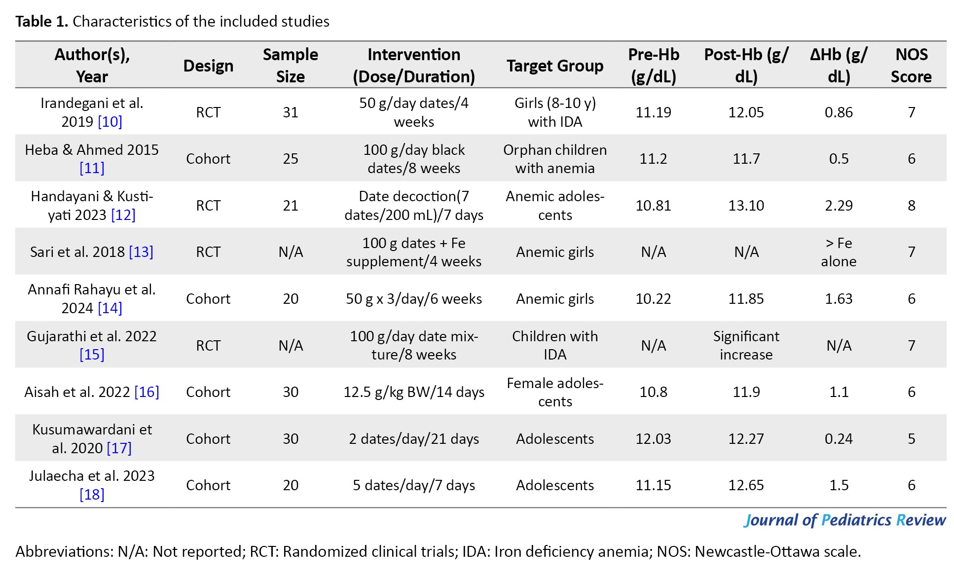Relevant information was extracted from eligible studies, including study design, sample size, intervention details, key findings, and limitations. Data synthesis focused on the nutritional properties of dates, their mechanisms of action, and their impact on anemia prevention.