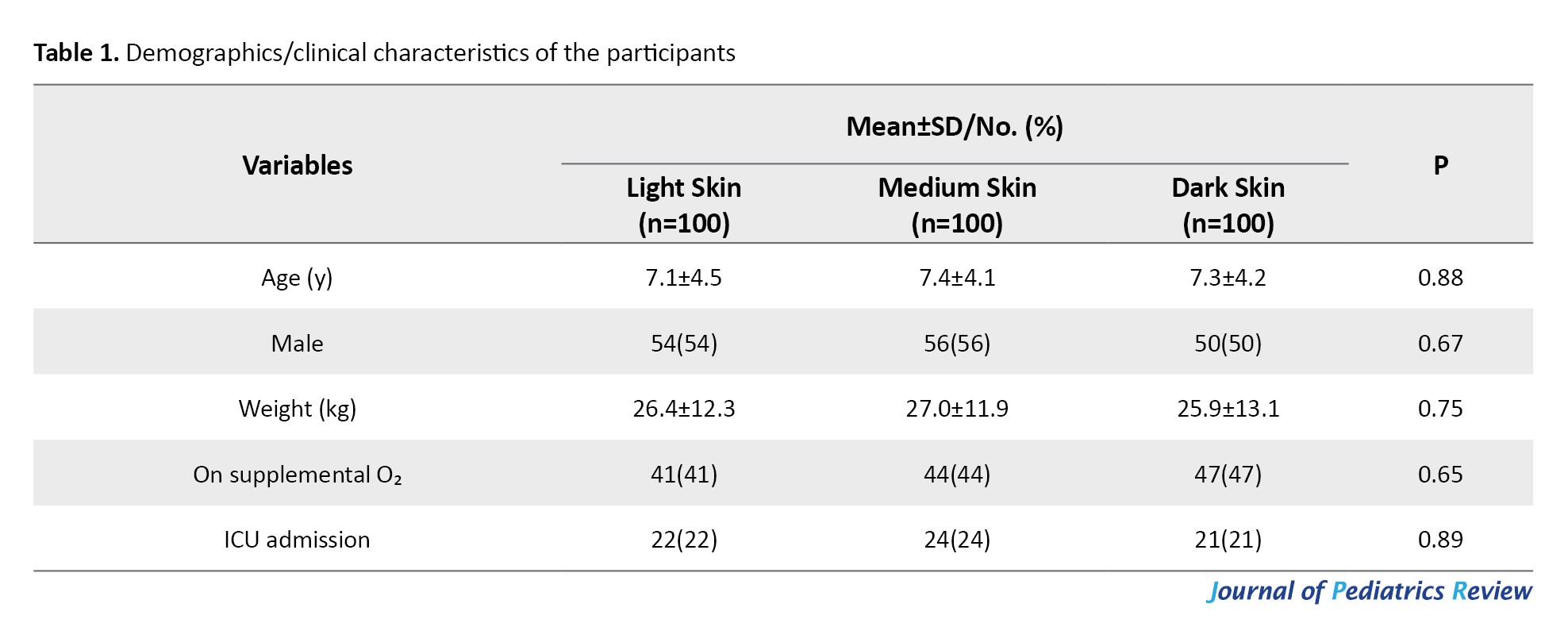 There were no significant differences in demographic/clinical characteristics among the three skin tone groups (P>0.05). Therefore, age, weight, and sex distribution, oxygen supplementation, and ICU admission rates were similar among light-, medium-, and dark-skinned children at baseline.