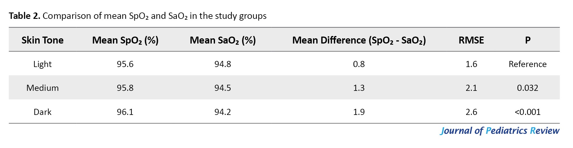 Table 2, pulse oximetry (SpO₂) overestimated SaO₂ in all groups, with a significant bias observed in the dark-skinned group (P<0.001).