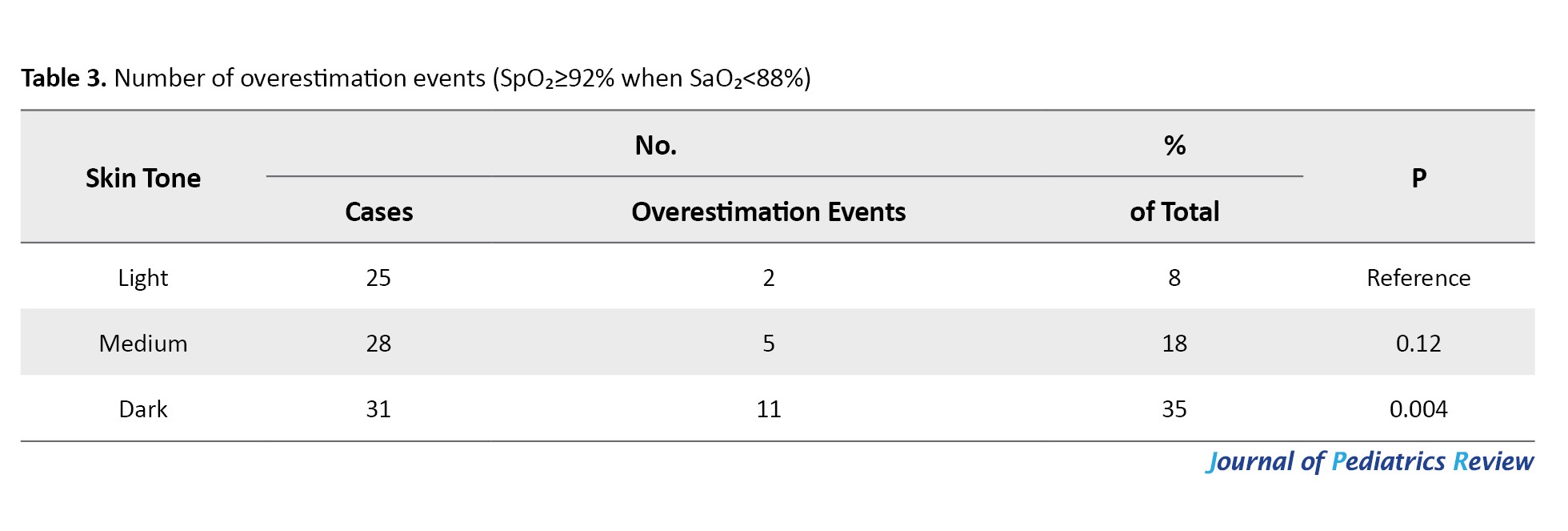 Table 3, among children with SaO₂<88%, overestimation by pulse oximetry (SpO₂≥92%) occurred more frequently in the dark-skinned group (35%) compared to the medium-skinned (18%) and light-skinned (8%) groups.