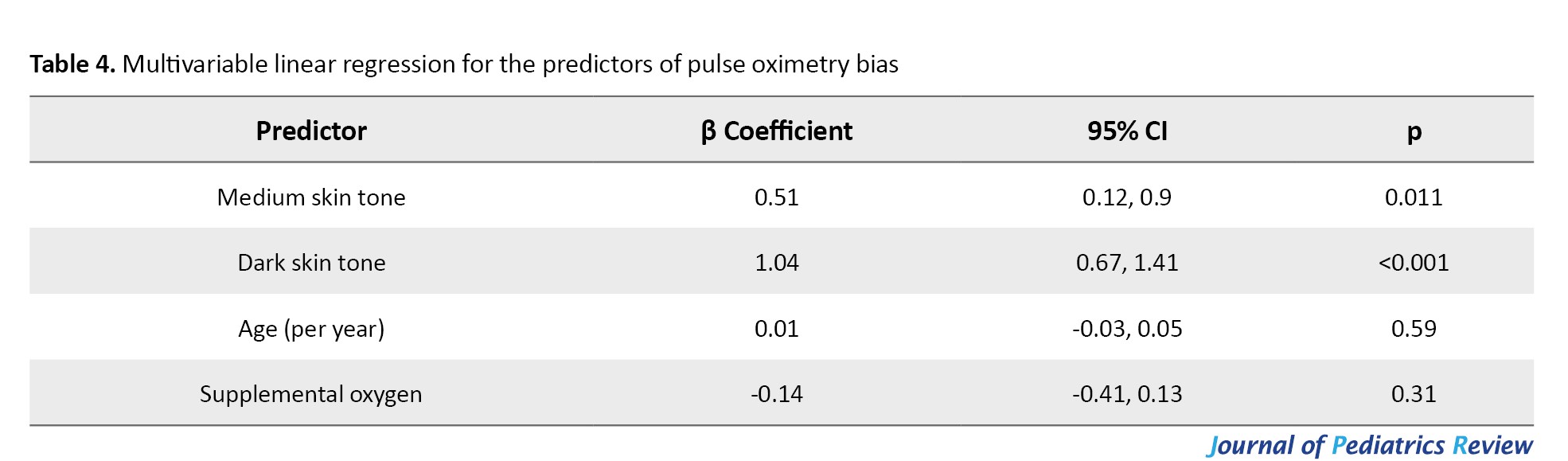 Table 4) showed that dark skin tone (P<0.001) and medium skin tone (P=0.011) were significantly associated with greater pulse oximetry bias.