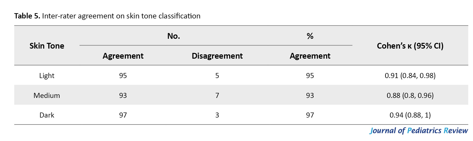 There was high inter-rater agreement in skin tone classification using the Fitzpatrick scale, with overall agreement exceeding 90% in all categories (κ=0.91 for light, 0.88 for medium, and 0.94 for dark skin tones) (